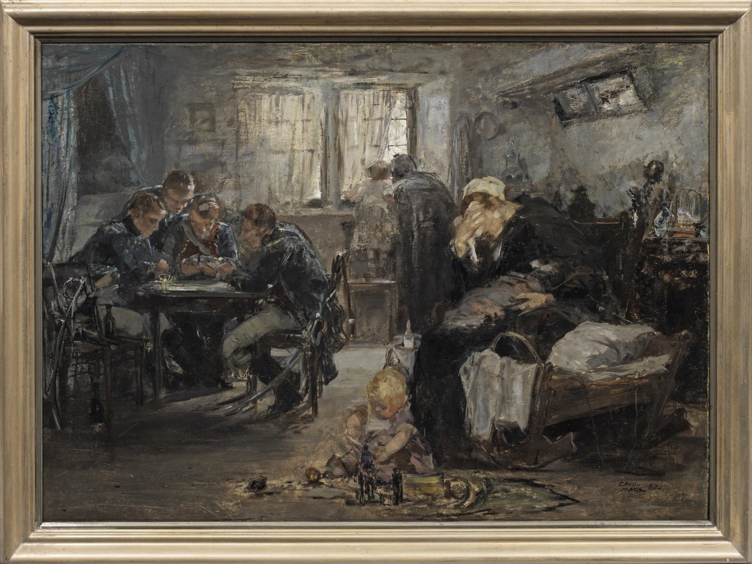 Interieurszene mit verzweifelter junger Mutter und einer am Tisch sitzenden Gruppe von vier Soldaten, im Vordergrund ein am Boden spielendes Kind, im Hintergrund eine weitere, am Fenster stehende, Ausschau haltende Frau mit Kind. Mit schnellem Duktus gemaltes Hauptwerk Marrs, das impressionistische und realistische Stilmittel verbindet und durch seine Datierung 1882 wohl das früheste bekannte Gemälde des deutsch-amerikanischen Künstlers ist. Carl von Marr studierte in Weimar, Berlin und München u. a. bei Karl Gussow, Wilhelm von Lindenschmit und Otto Seitz; 1893 wurde er selbst als Professor an die Münchner Kunstakademie berufen. 1896 erhielt er auf der Großen Berliner Kunstausstellung eine Goldmedaille und wurde 1909 mit dem bayerischen Adel ausgezeichnet. Öl/Lwd.; R. u. sign. u. dat. (18)82. 70 cm x 99 cm. Rahmen.