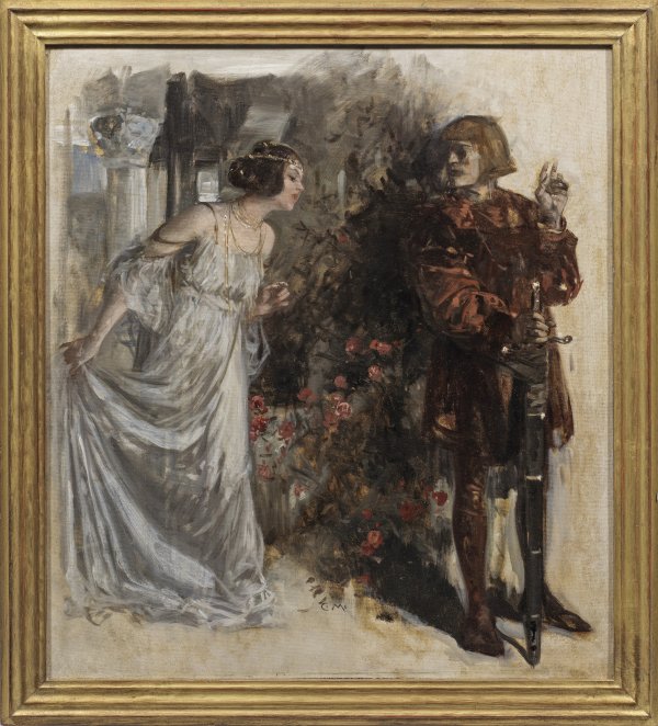 Märchenhafte Szene mit Hofdame bzw. Prinzessin ("Frau Melusine") und jungem Ritter als Illustration für das gleichnamige Gedicht "Der Rechte" von Albert Roderich (in "Fliegende Blätter", 1901, Heft 2922, S. 55). Der deutsch-amerikanische Maler studierte in Weimar, Berlin und München u. a. bei Karl Gussow, Wilhelm von Lindenschmit und Otto Seitz; 1893 wurde er selbst als Professor an die Münchner Kunstakademie berufen. 1896 erhielt er auf der Großen Berliner Kunstausstellung eine Goldmedaille und wurde 1909 mit dem bayerischen Adel ausgezeichnet. Marr widmete sich vornehmlich der Genremalerei, ab 1899 schuf er überdies zahlreiche Illustrationen für die "Fliegenden Blätter". Öl/Malkarton bzw. mit Lwd. bespannter Karton. M. u. monogr.; Verso bez. u. betitelt. 60 cm x 52 cm. Rahmen.