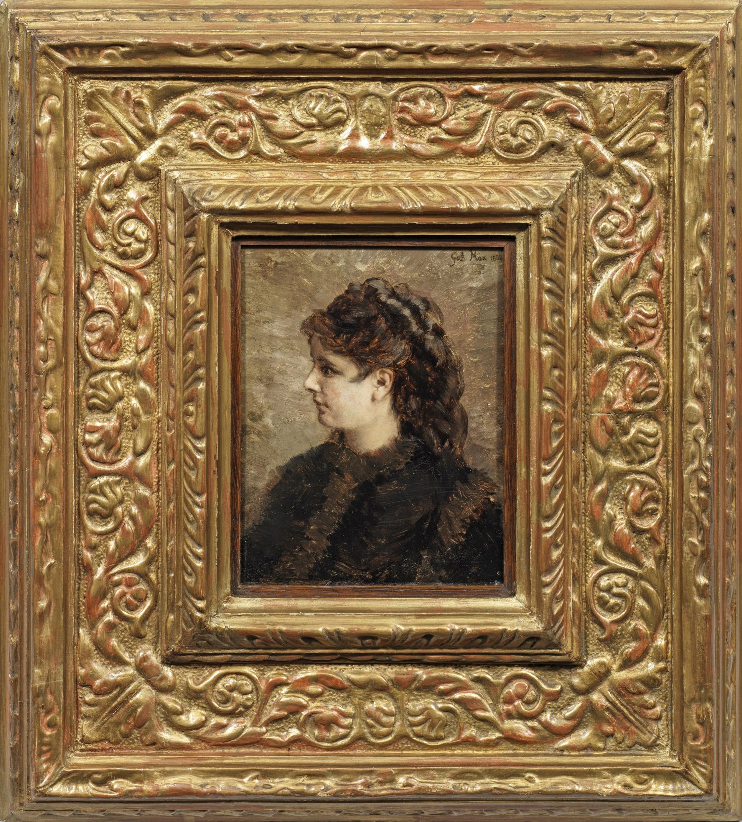 Mit weichem Duktus und in tonigem Kolorit gemaltes, einfühlsam charakterisierendes, in seiner Privatheit und umprätentiösen Unmittelbarkeit seltenes Porträt der Kaiserin Elisabeth von Österreich und Königin von Ungarn (1837 - 1898), die von ihren Geschwistern "Sisi" genannt wurde. Die Tochter von Herzog Max Joseph in Bayern (1808-1888) aus dem Haus Wittelsbach heiratete 1854 ihren Cousin Franz Joseph I. von Österreich. Gabriel Cornelius von Max, der 1900 mit dem bayerischen Personaladel ausgezeichnet wurde, studierte an den Akdemien in Prag, Wien und München u.a. bei Carl Theodor von Piloty. Durch seine Münchener Studienkollegen Hans Makart und Franz von Defregger lernte er dort auch den "Malerfürsten" Franz von Lenbach kennen. Zu seinen Hauptsujets neben Affenmotiven zählten meist kleinformatige Bildnisse junger Mädchen und Frauen, denen er einen traumverlorenen Ausdruck verlieh. Öl/Mahagonitafel. R. o. sign. u. dat. 1882. Ca. 20 cm x 15,5 cm. Rahmen.