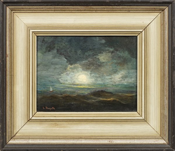 Douzette ging 1855/56 nach Berlin, wo er Schüler des Marine- und Landschaftsmalers Hermann Eschke wurde. Ab 1860 reiste er regelmäßig an die Ostseeküste, nach Rügen und auf den Darß. Schon in den 1860er Jahren entstanden erste Mondscheinlandschaften, die eines seiner Hauptsujets wurden. Auf einer Paris-Reise 1878 lernte er die französische Pleinairmalerei und die Gemälde der Schule von Barbizon kennen. Douzette, der ab 1895 in Barth lebte, war zugleich mit der nahegelegenen Künstlerkolonie in Ahrenshoop verbunden. Öl/Kupfertafel. L. u. sign. (oder bez.) "L. Douzette". 13,6 cm x 18,7 cm. Rahmen.