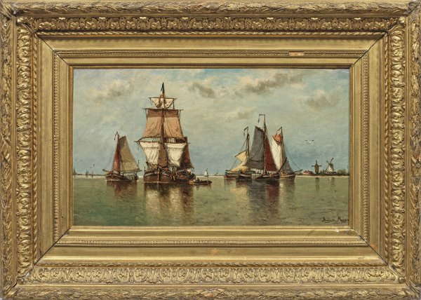 In Motiv und Stil charakteristisches, stimmungsvolles Werk Musins, der seine künstlerische Ausbildung bei seinem Vater François-Etienne Musin erhielt. Er setzte die Tradition im selben Sujet der Marinemalerei mit ebenso großem Erfolg wie sein Vater fort, übertrug diese jedoch in einen moderneren Stil. Ab 1872 stellte er bis nach Amerika hin aus und wurde in Brüssel ansässig. Öl/Mahagonitafel. R. u. sign.; Verso Wachssiegel des Künstlers, altes Etikett mit undeutl. Bez.; 30,5 cm x 58 cm. Rahmen.