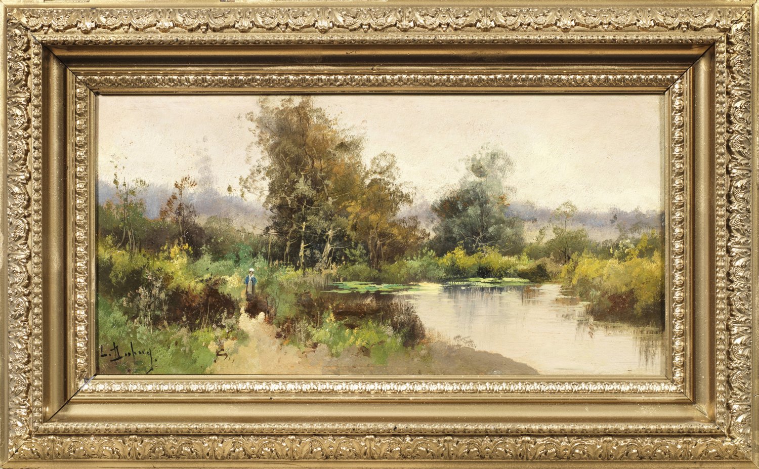 Durch eine Bäuerin als Staffagefigur belebte Stimmungslandschaft in der Tradition der Schule von Barbizon. Galien-Laloue wurde seit der Zeit um 1900 insbesondere durch seine atmophärisch-gestimmten Paris-Impressionen bekannt, in welchen er die einzigartige Atmosphäre und das pulsierende Leben in der Metropole einfing. Öl/Malkarton. L. u. sign. unter dem Pseudonym "L. Dupuy". 17,5 cm x 35,5 cm. Rahmen.