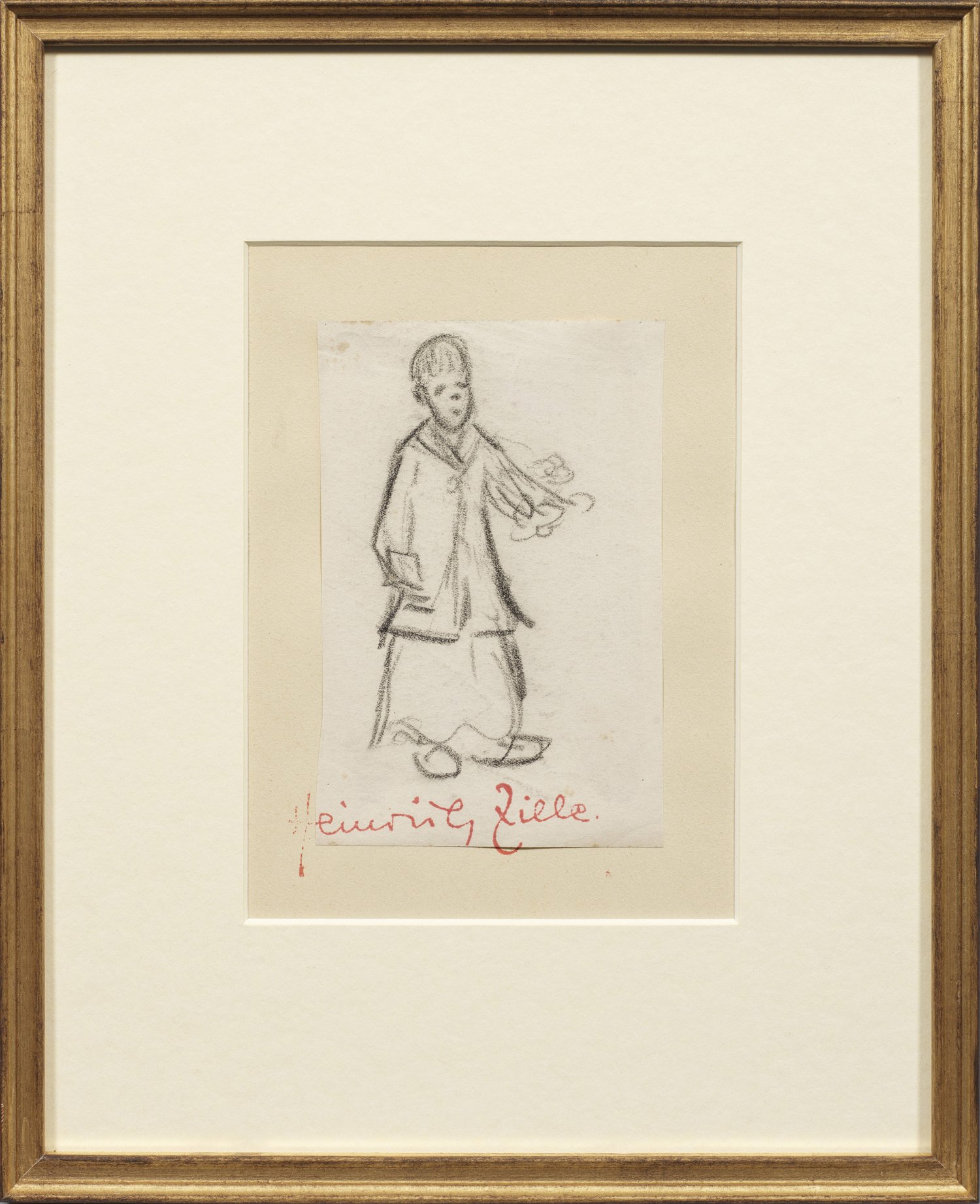 Mit schwungvoll konturierenden, schnellen Strichen die Figur charakterisierendes Blatt Zilles, das seine Meisterschaft als Zeichner zum Ausdruck bringt. Kohle/Papier. Nachlass-Stempel "Heinrich Zille" in Rot (Lugt 2676b, Rosenbach 1). Ca. 14,8 cm x 9,8 cm. Rahmen.