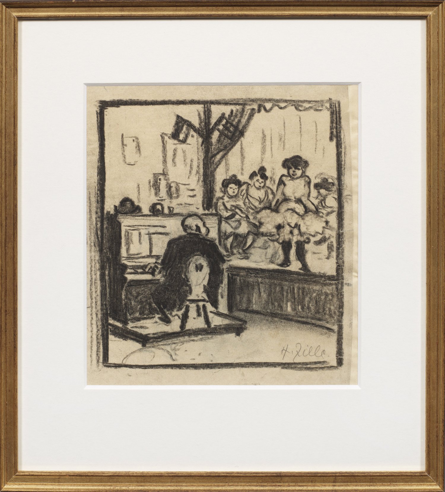 Der Blick auf eine beengte Kabarett- bzw. Varieté-Bühne. Die mit fest umreißenden Strichen und starken Hell-Dunkel-Kontrasten arbeitende Darstellung spiegelt auch in seiner Beschränkung auf das Quadratformat die kleinen Arbeiter-Vergnügungen im Berliner "Milljöh" zur wilhelminischen Kaiserzeit wider. Kaum ein anderer Künstler vor und nach ihm hat das Leben der unteren sozialen Schichten in Berlin in all seinen Facetten so intensiv, sympathisch und zugleich sozialkritisch geschildert wie der Zeichner und Grafiker Zille. Kohle/Papier. R. u. sign.; 21 cm x 19 cm.