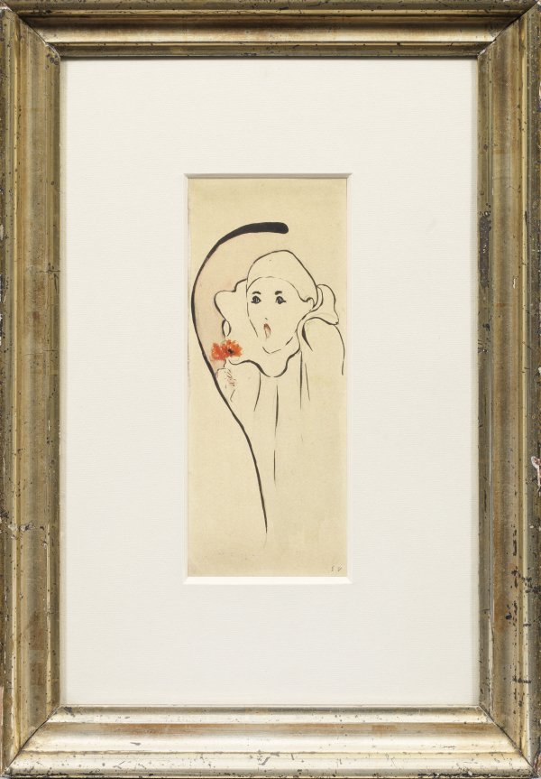 Um 1890/91 entstandenes Blatt aus einer Werkreihe Vuillards mit Pierrot-Motiven. Dargestellt ist die bedeutende französische Komikerin, Sängerin und Pantomimekünstlerin Félicia Mallet (1863 - 1928) in ihrer Hauptrolle des Pierrot in dem Pantomime-Stück "L'Enfant prodigue", das 1890 in Paris aufgeführt wurde. Mallet startete mit dieser Rolle nicht nur ihre Karriere, sondern inspirierte auch den jungen Vuillard zu einer ganzen Reihe von Aquarell-Zeichnungen, zu denen auch diese gehört. Weitere Pierrot-Blätter Vuillards befinden sich u. a. im Musée d'Orsay in Paris (Inv.-Nr. RF 54897). Sie entstanden in einer Zeit, als sich Vuillard 1890 der Avantgarde-Künstlergruppe "Les Nabis" anschloss, Theaterdekorationen, Bühnenbilder und -programme entwarf und seine Grafiken in der 1889 gegründeten Zeitschrift "La Revue Blanche", zusammen mit Pierre Bonnard, Henri de Toulouse-Lautrec und Félix Vallotton erschienen. Tusche bzw. Feder u. Aquarell/Papier. R. u. Nachlass-Monogramm-Stempel "E. V." (Lugt 909c) aus dem Atelier des Künstlers. 24,8 cm x 10,4 cm. Rahmen.