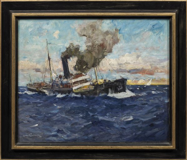 Impressionistisches, motiv- und stiltypisches Marinebild Sandrocks, den besonders die maritime Welt faszinierte. Sandrock erhielt seine künstlerische Ausbildung beim Landschafts- und Marinemaler Hermann Eschke. Ab 1897 beschickte er die Großen Berliner Kunstausstellungen. 1912 rühmte ihn Max Osborn als "eins der stärksten und hoffnungsvollsten Talente der Berliner Malerzunft". 1913 erhielt er auf der Internationalen Kunstausstellung in München eine Goldene Medaille. Öl/Malkarton. L. u. sign.; Verso vom Künstler eigenhändig bez. u. betitelt mit Adresse in Berlin-Friedenau. 53,8 cm x 65,7 cm. Rahmen.