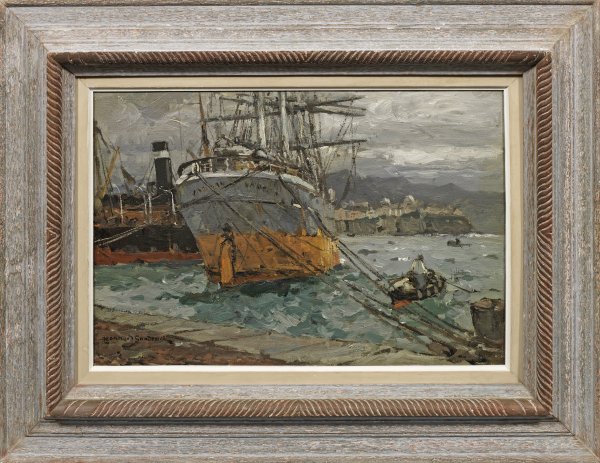 Mit schnellem, breitem Duktus und pastosem Farbauftrag gemaltes, für Sandrock charakteristisches Hafenmotiv. Der von der Haager Schule beeinflusste Maler beschickte ab 1897 die Großen Berliner Kunstausstellungen, zunächst mit Motiven aus norddeutschen Hafenstädten. 1912 rühmte Max Osborn ihn als "eins der stärksten und hoffnungsvollsten Talente der Berliner Malerzunft", den der Hafen von Genua "mit seinen dunklen Schiffskolossen" vor den sich am bergigen Ufer auftürmenden Häuserreihen besonders gereizt habe. Öl/Malkarton. L. u. sign.; Verso vom Künstler eigenhändig bez. u. betitelt mit Adresse in Berlin-Friedenau; Etikett der Ausstellung "Leonhard Sandrock (...) Norddeutscher Impressionismus", Kunsthalle Wilhelmshaven 1998. 34,2 cm x 51 cm. Rahmen.