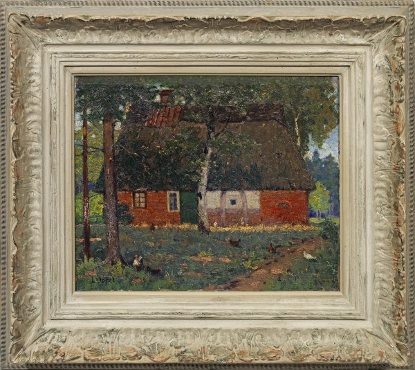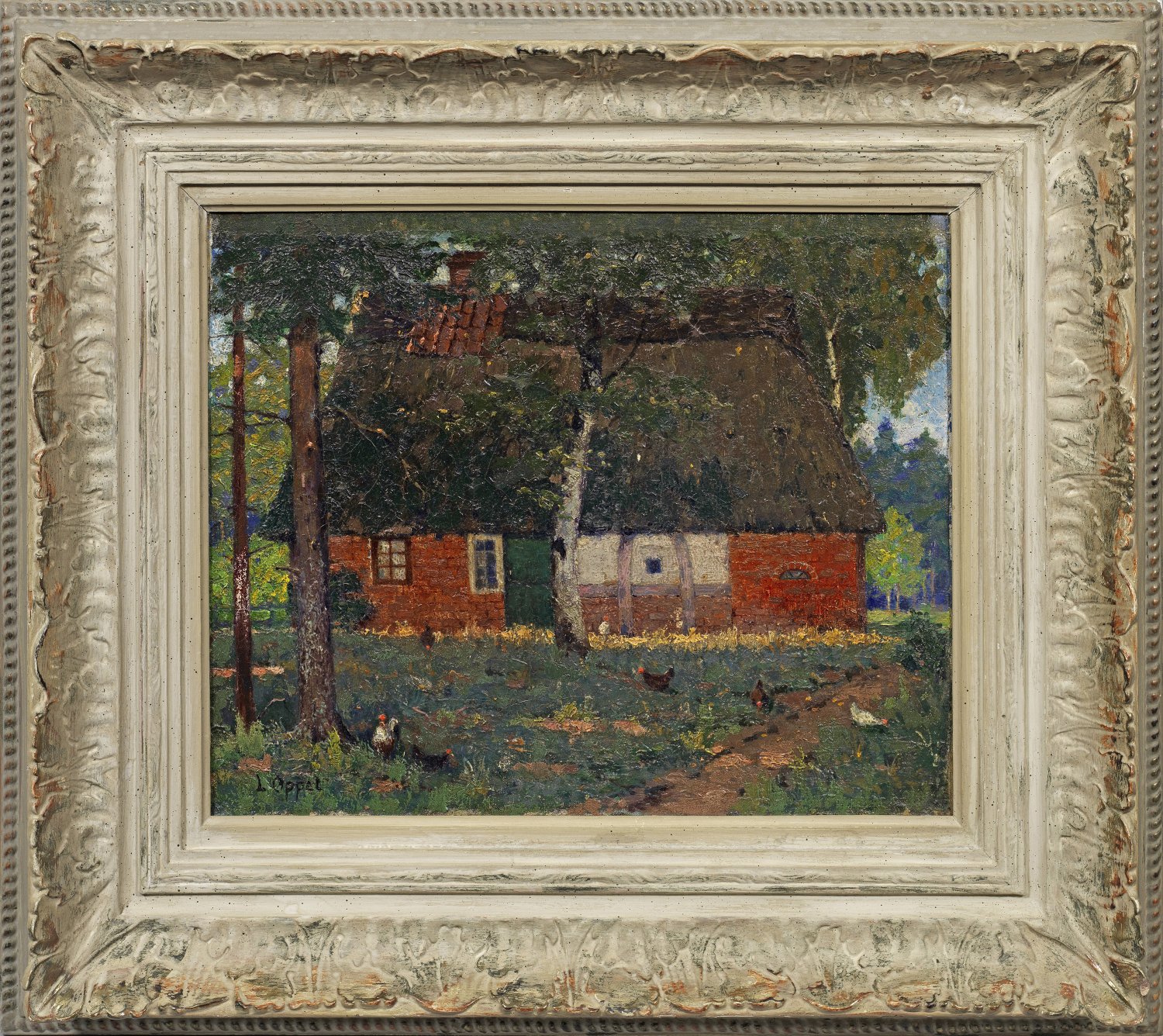 Impressionistische, wohl frühe Landschaft Oppels, die ab 1919 in Worpswede tätig war und dort zur zweiten Malergeneration gehörte. Außer der reinen Landschaft widmete sie sich mit Vorliebe figürlichen Motiven, besonders dem heiteren, kindlichen Treiben der Worpsweder Dorfkinder. Öl/Lwd.; L. u. sign.; 33 cm x 41 cm.