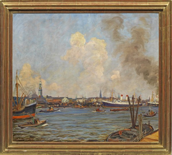 Mit schnellem, breitem, pastosem Duktus impressionistisch gemalte Partie des Hamburger Hafens, die künstlerisch durch die belebte Darstellung der Elbe mit Schleppern und Ozeandampfern sowie die virtuos skizzierte Stadtsilhouette herausragt. Öl/Lwd.; L. u. sign. u. dat. 1935 mit Ortsangabe Hamburg. 71 cm x 80 cm. Rahmen.