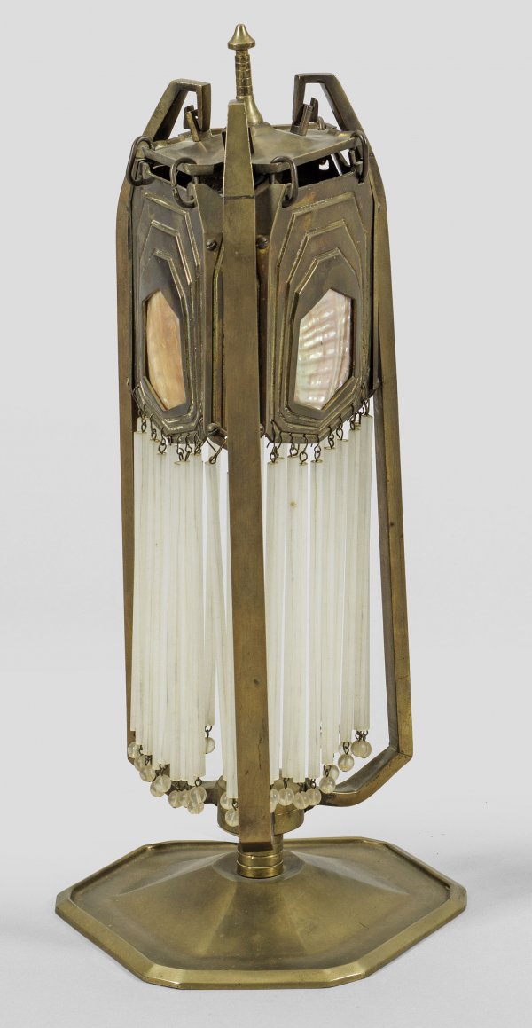 Tischlampe im Sezessionsstil 1-flg.; Messing, Perlmutt und satiniertes Glas. Über flacher, schräg ansteigender Sockelplatte gekantete Streben als Träger für Leuchtmittel. Dazwischen profilierte Blendschirme mit eingesetzten Reserven aus Muschel. Üppiger Behang aus langen Glasstäben mit Kugelabschlüssen. Elektrifiziert. H. 43 cm.