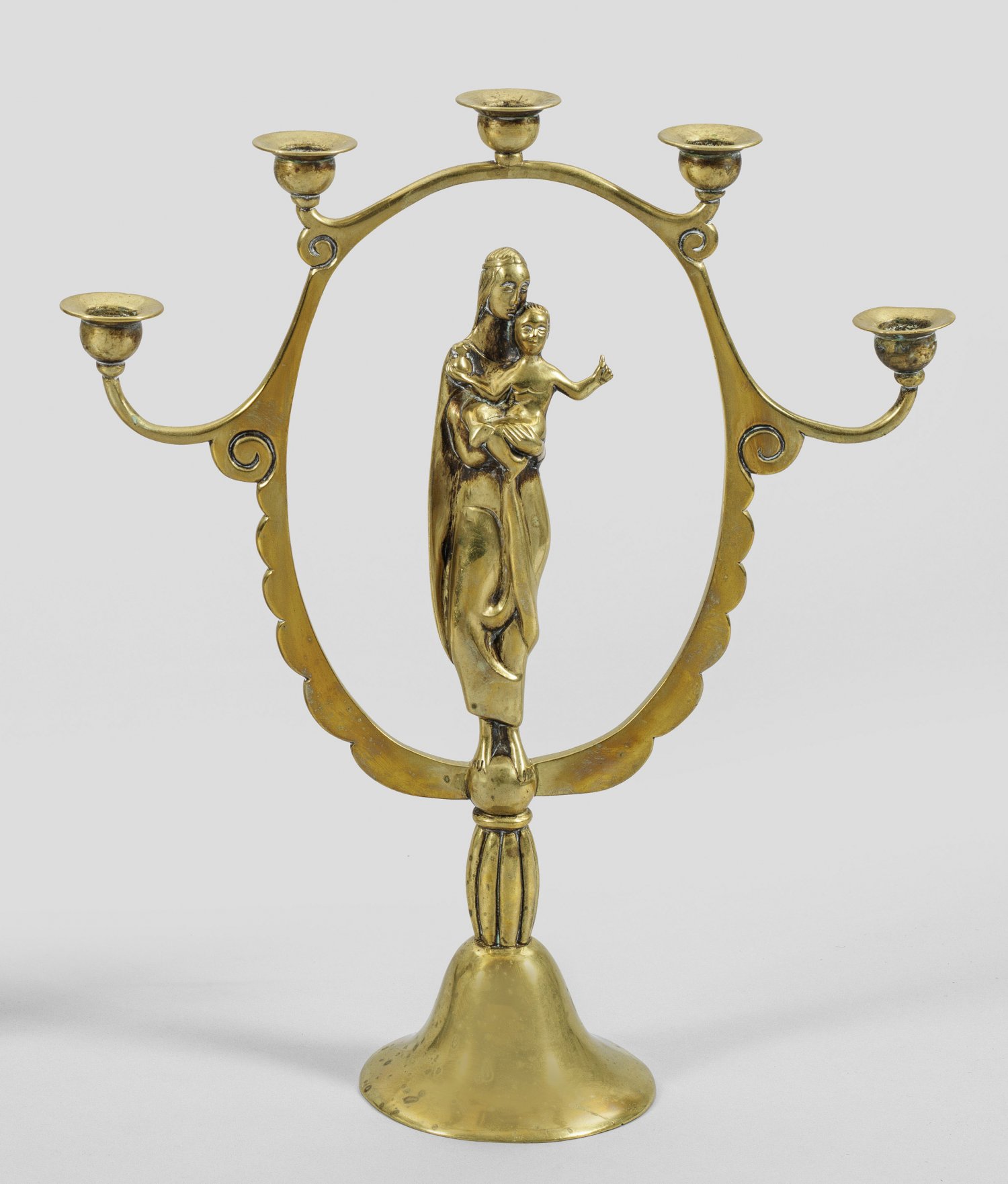 Figürlicher Art Déco-Leuchter von Albert Gustav Bunge 5-flg.; Messing, gegossen. Auf glockenförmigem Fuß und kurzem, geripptem Schaft stehende Madonna, umrahmt von einer am Rand geschweiften, ovalen Bogenform als Träger für die Tüllen. Entw. Albert Gustav Bunge, 1922. H. 40 cm.