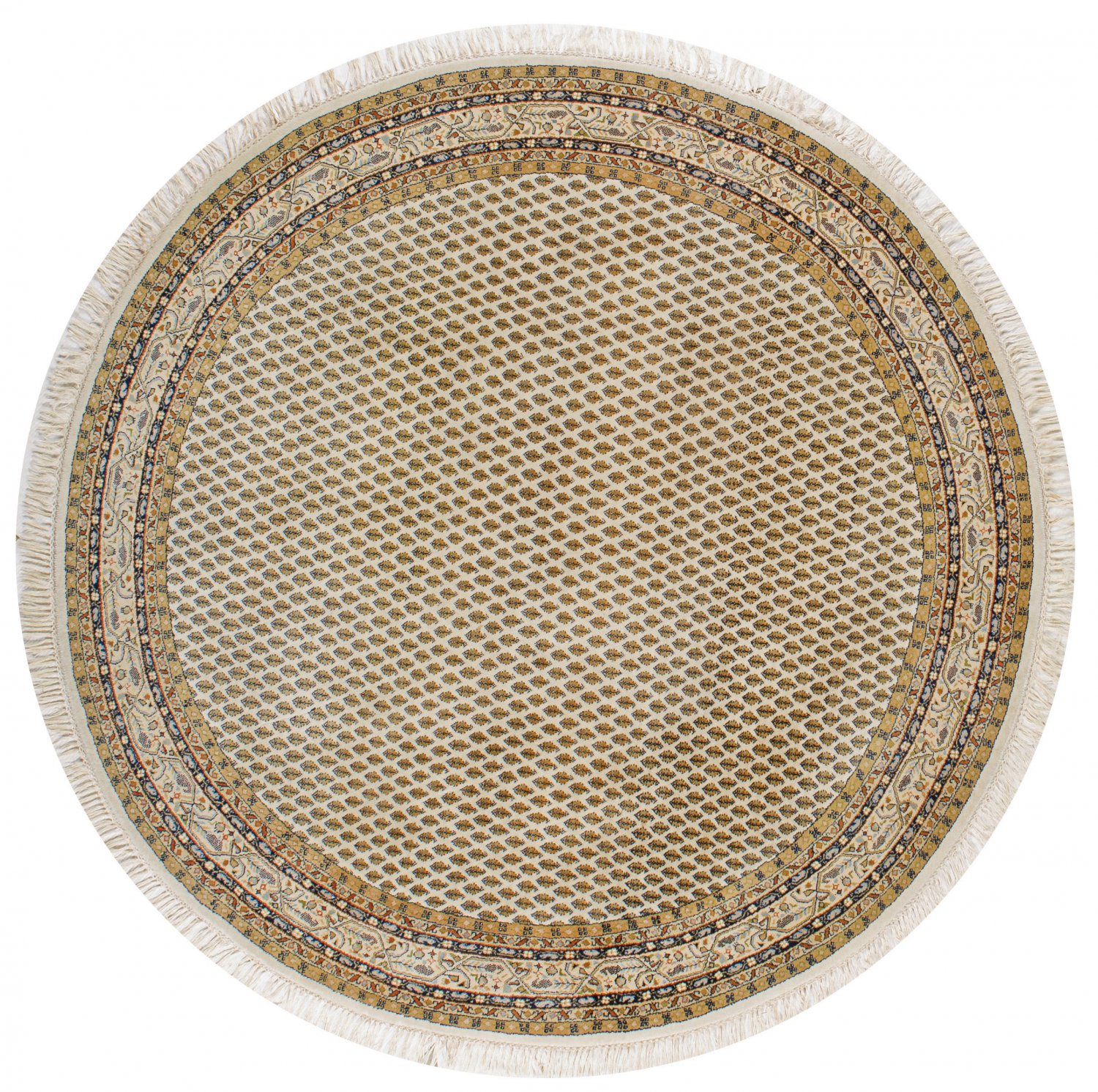 Runder Salonteppich Indien. Wolle auf Baumwolle. Im beigefarbenen Innenfeld flächendeckende Musterung aus Blüten im Rapport sowie umlaufend mehrteilige Bordüre in Beigetönen. D. 200 cm.