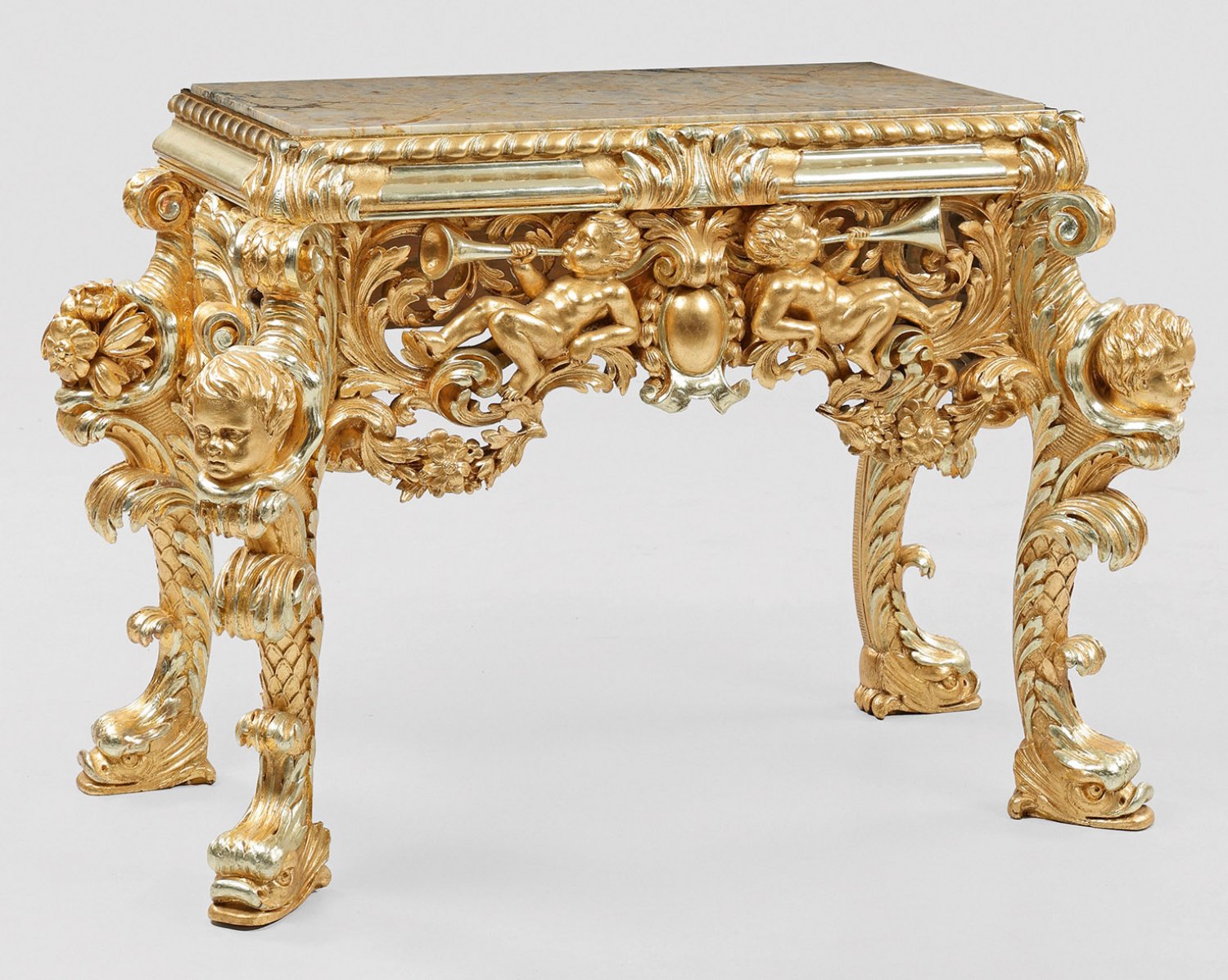 Großer repräsentativer Konsoltisch im Louis XIV-Stil Holz geschnitzt gefasst und vergoldet. Passig geschweifte durchbrochen gearbeitete Zarge aus zentralem Medaillon mit Plattbekrönung flankiert von reliefplastisch gestalteten Putten mit Fanfaren sowie üppigen eingerollten Blattvoluten und Festons. Teilw. schräggestellte Beine aus Füllhörnern großen Puttenköpfen und vollplastisch gestalteten Delfinen. Profilgerahmte Deckplatte aus cremefarbenem hellgrau und orangefarben gemasertem Marmor. H. 90 cm. 130 cm x 65 cm.