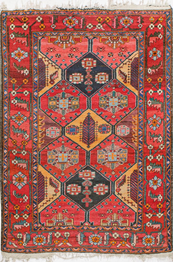 Bachtiar-Brücke Persien. Wolle auf Baumwolle. Im Innenfeld flächendeckende Felder-Musterung in unterschiedlichen Rottönen und Gold. Umlaufend breite Bordüre aus stilisierten Blütenranken. 129 cm x 198 cm.