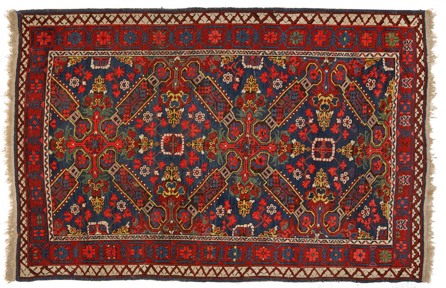Alte kaukasische Brücke Kaukasus. Mitte 20. Jh. Wolle auf Wolle. Im blauen Innenfeld grüne Rautenformen aus Blattwerk sowie kreuzförmig angelegte Reserven. Umlaufend rote Hauptbordüre aus stilisierten Blütenranken flankiert von schmalen Nebenbordüren. Altersspuren. 187 cm x 132 cm.