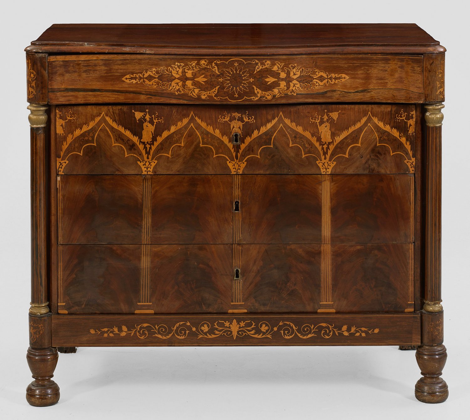 Große Louis Philippe-Kommode Mahagoni und Palisander furniert sowie Einlagen aus Ahorn. Gerader, querrechteckig angelegter Korpus, flankiert von eingestellten Vollsäulen auf Balusterfüßen. In der Front vier, teilw. geschweifte Schubladen unterschiedlicher Größe, optisch durch architektonisch gegliederten Intarsiendekor mit Chinoiserieelementen verbunden. Altersspuren, teilw. besch.; H. 106 cm. 123 cm x 61 cm.