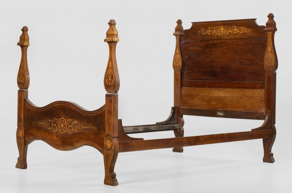 Louis Philippe-Bettgestell Mahagoni und Palisander furniert sowie Einlagen aus Ahorn. Hohes geschweift ansteigendes Betthaupt flankiert von balusterförmigen flachen Pfosten. Korrespondierendes Bettende sowie schmale Seitenwangen. Reicher Intarsiendekor aus Blattwerk. H. 138 cm. 131 cm x 198 cm.