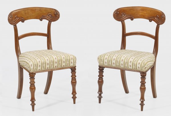 Paar viktorianische Stühle Mahagoni massiv und furniert. Trapezförmige Zarge auf mehrfach gegliederten teilw. gekanteten Balusterbeinen. Rückenlehnenrahmung mit breitem gewölbtem und blattreliefiertem oberen Abschluss. Sitzfläche gepolstert und bezogen. Sitz-H. 47 cm.