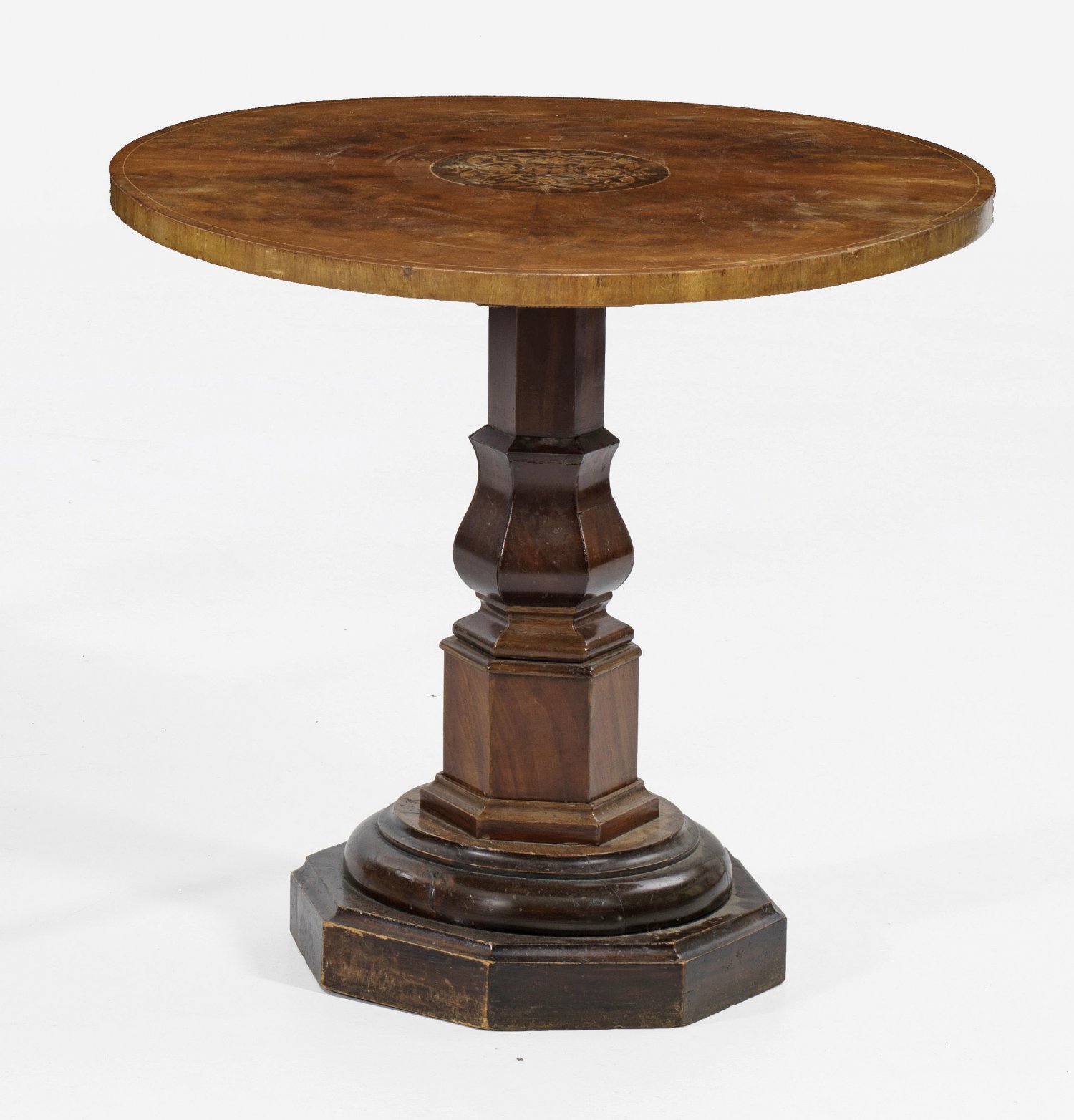 Kleiner Spätbiedermeier-Salontisch Mahagoni furniert sowie Einlagen aus unterschiedlichen Edelhölzern. Über oktogonaler Sockelplatte mehrfach gegliederter gekanteter Balusterschaft als Träger für runde Deckplatte mit intarsiertem Tondo. H. 64 cm. D. 68 cm.