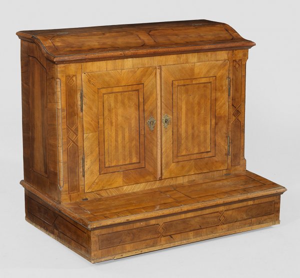 Barock-Betpult Nussbaum furniert. Gerader zweitüriger Korpus mit gerundeten Ecklisenen auf entsprechendem Zargenkasten mit breiter aufklappbarer Kniefläche. Geschweift ansteigender aufklappbarer oberer Abschluss. Flächendeckend breit gerahmte Furnierfelder von Bandeinlagen begrenzt. Altersspuren. H. 93 cm. 108 cm x 69 cm.