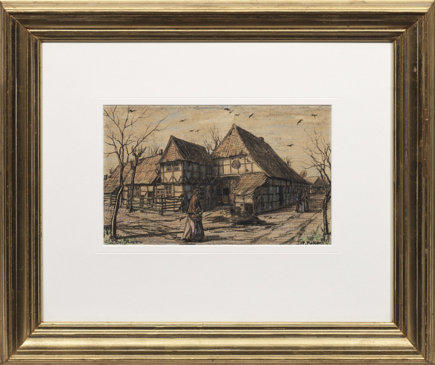 Durch Figurenstaffage belebter Blick auf das pittoreske Fachwerk-Bauernhaus in Kirchrode, das laut rücks. Klebezettel 1614 erbaut wurde, an der Ecke Tiergartenstr./Kronsbergerstr. lag und um 1926 abbrannte. Schwarze u. farbige Kreide/Papier. R. u. sign.; Ca. 19,5 cm x 31,5 cm (Passepartoutausschnitt). Rahmen.