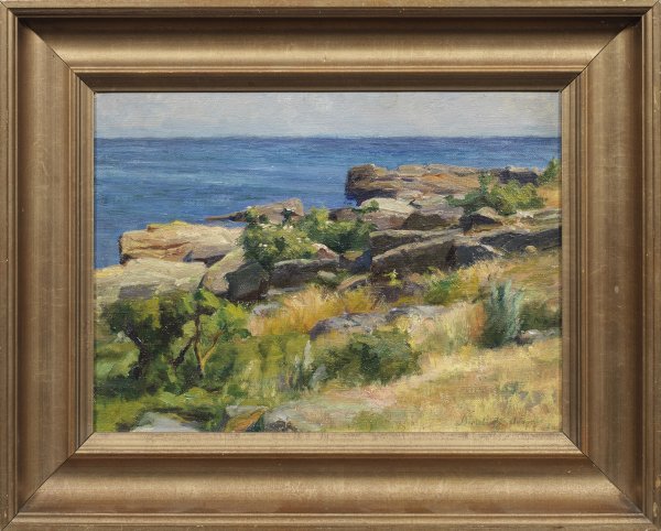 Hansen-Svaneke gehört zu den bedeutendsten Bornholmer Malern. Nach seinem Studium (1908-1913) bei Viggo Johansen an der Kopenhagener Akademie widmete er sich außer Interieurszenen im späten Oeuvre verstärkt den Landschaften der Insel. Öl/Lwd.; R. u. sign.; 26 cm x 36 cm. Rahmen.