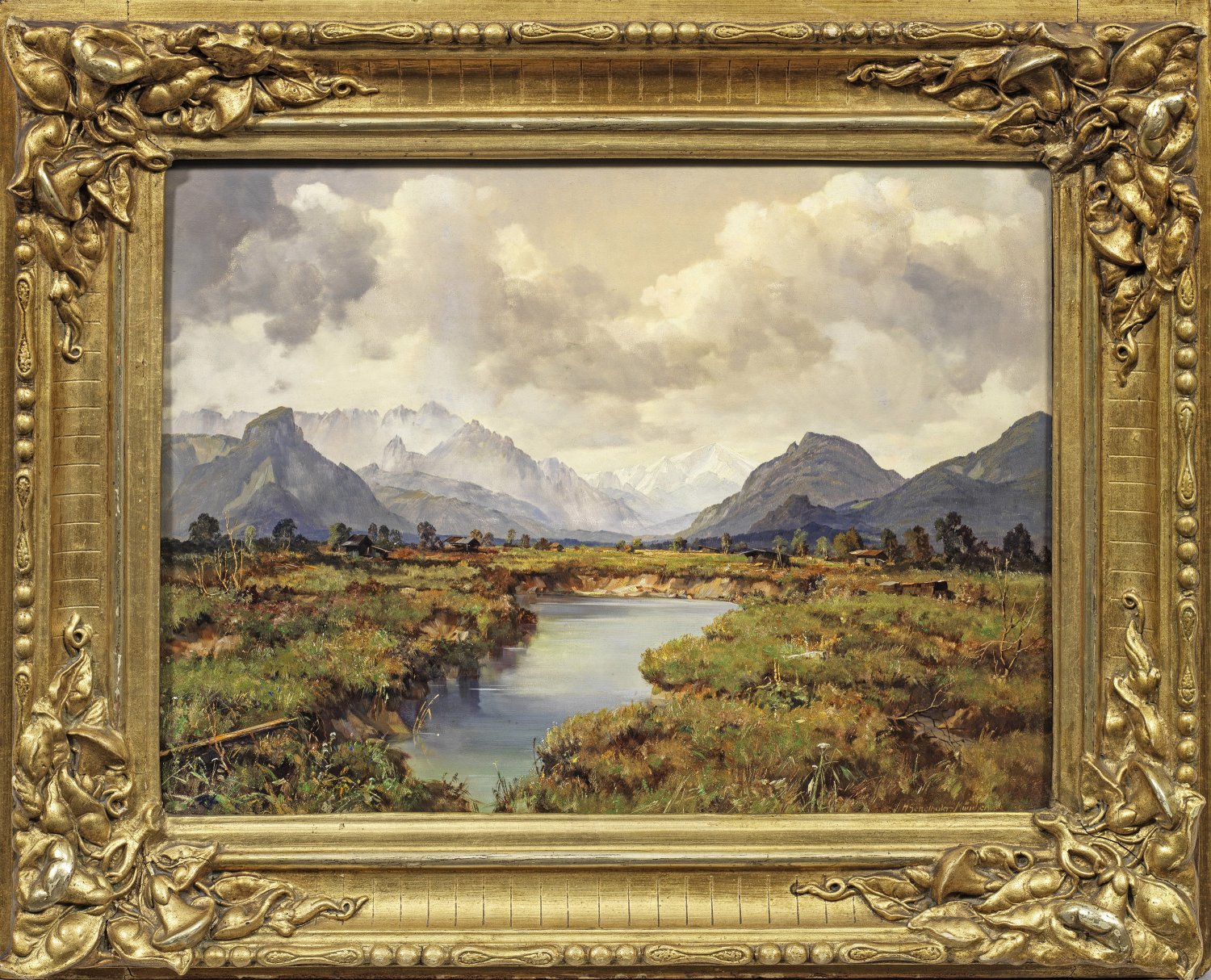Atmosphärisch gestimmte Landschaft des 1912-1944 in München ansässigen Künstlers, der bis zu seinem Tod vonehmlich die Bergwelten Bayerns, Salzburgs und Tirols malte. Seine erfolgreiche Teilnahme 1930 an der "Internationalen alpinen Kunstausstellung" in Budapest ließ ihn weithin bekannt werden. Öl/Holztafel. R. u. sign. mit Ortsangabe München; 31 cm x 41 cm. Rahmen.