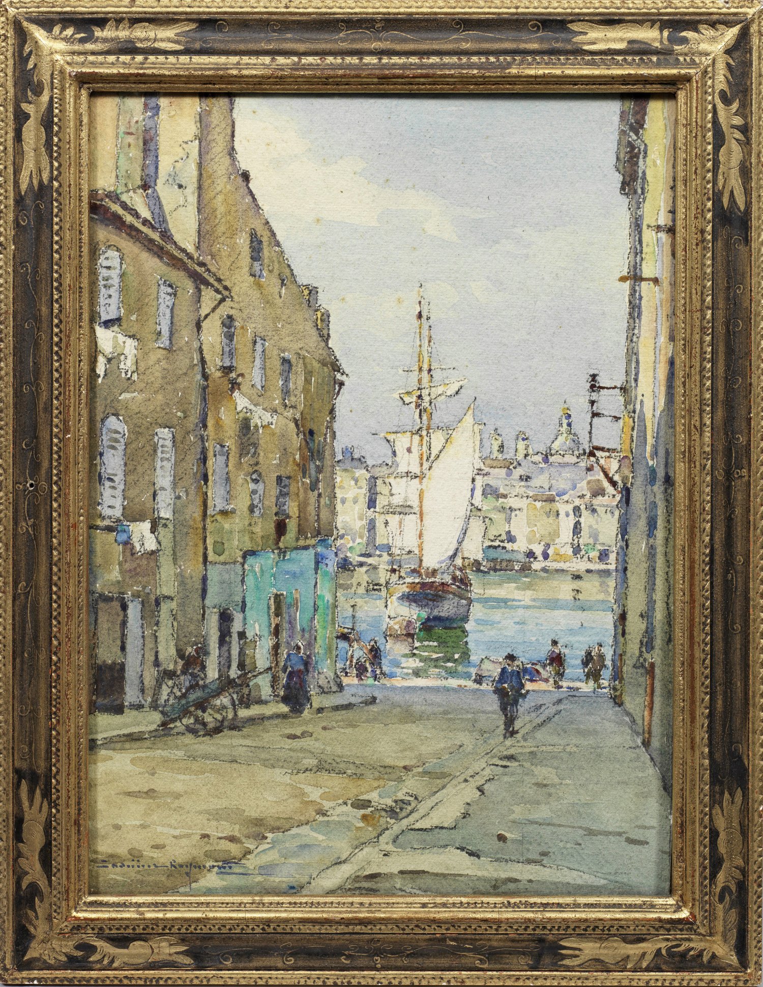 Raymond, der an der École des Beaux-Arts de Marseille ausgebildet und von Felix Ziem beeinflusst wurde, malte mit Vorliebe Landschaften der Provence, Ansichten von Martigues, Marseille und Venedig. Aquarell u. schwarze Kreide/Papier. Verso auf dem Rückenkarton alte Bez./Betitelung "No. 29 (/) Marseille (/) Le Vieux Port". 38 cm x 28 cm. Rahmen.