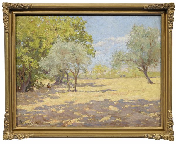 Impressionistische, lichtdurchflutete Landschaft. Vandoros studierte an der Kunsthochschule in Athen sowie in München und Berlin, u. a. bei Wilhelm Müller-Schönefeld. Öl/Holztafel. L. u. sign.; 26,2 cm x 34,3 cm. Rahmen.