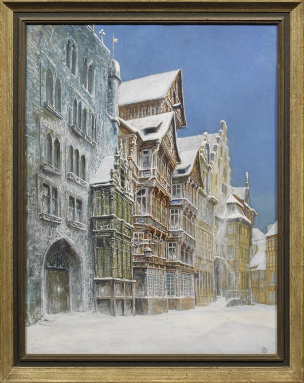 Blick auf das Tempelhaus (Tempelherrenhaus) und Wedekindhaus. Gouache/Papier. R. u. sign. u. dat. 1933. 77 cm x 56 cm. Rahmen.