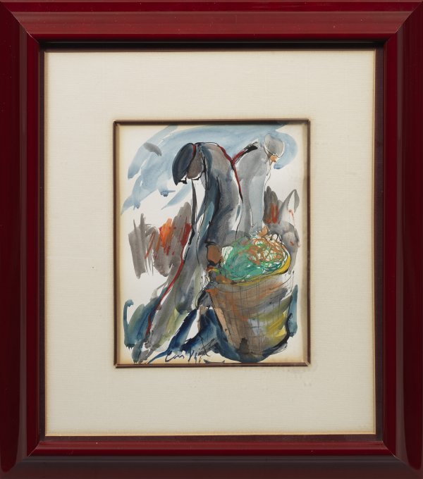 Stehende männliche Figur und Figurenpaar mit großem Korb