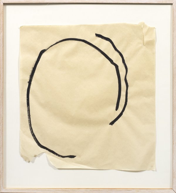 Abstrakte Ovalkomposition auf teilw. bewusst angerissenem Blatt, wodurch die Arbeit eine dreidimensionale Wirkung erhält. Seit den 1980er Jahren erlangte Prangenberg durch seine Teilnahme an der Documenta 7 in Kassel (1982) internationale Bekanntheit und erhielt zahlreiche Ausstellungen, u. a. in der Kunsthalle in Bremen und in der Neuen Pinakothek in München. Tusche/dünnes Papier. Verso auf dem Rückenkarton bez. u. betitelt. Blatt ca. 53,5 cm x 50 cm. Rahmen.