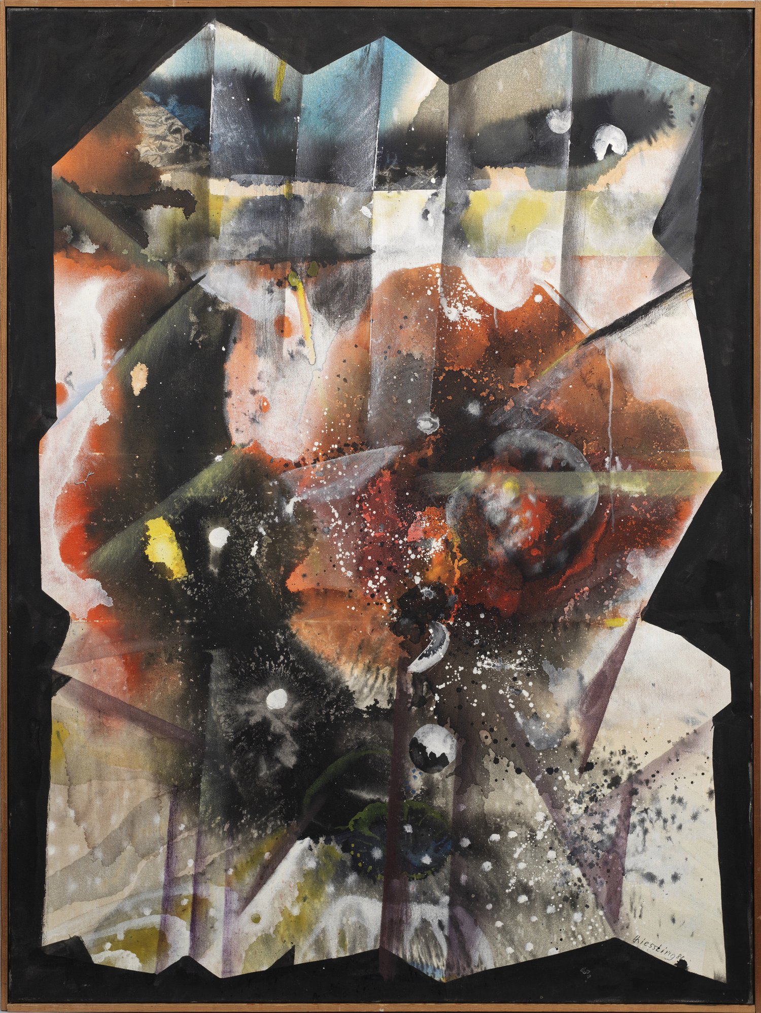 Späte Arbeit Kiesslings aus einer Werkreihe der "Faltungen", die er als Metallplastiken und Gemälde realisierte. Öl oder Acryl/Lwd.; R. u. sign. u. dat. (19)88. 130 cm x 99,5 cm. Rahmen-/Atelierleiste.