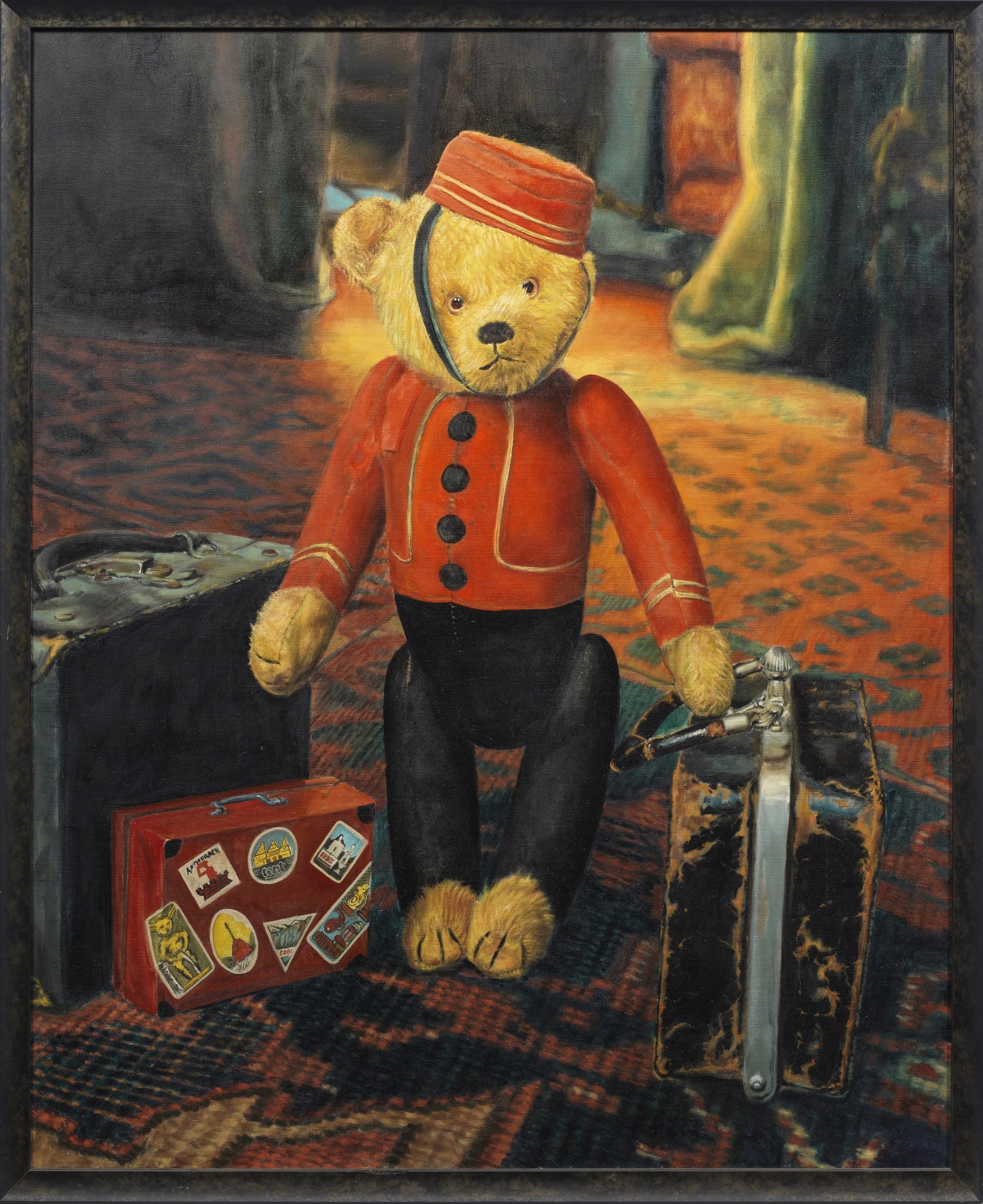 Darstellung eines Teddybären als Hotelpage mit Koffern. Öl oder Acryl/Lwd.; Verso sign. "(...) Lichwoski", dat. 2000 u. Polnisch betitelt. Ca. 110 cm x 90 cm. Rahmen.