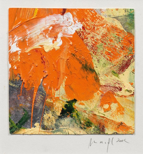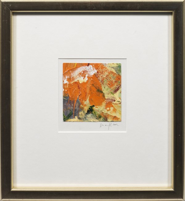 Acryl u. Mischtechnik/dünner Malkarton. R. u. auf dem Unterlegkarton sign. u. dat. 2002. Verso nochmals sign., betitelt u. dat. (in Fotokopie auf Rahmenrücks.). 12 cm x 12 cm. Rahmen.