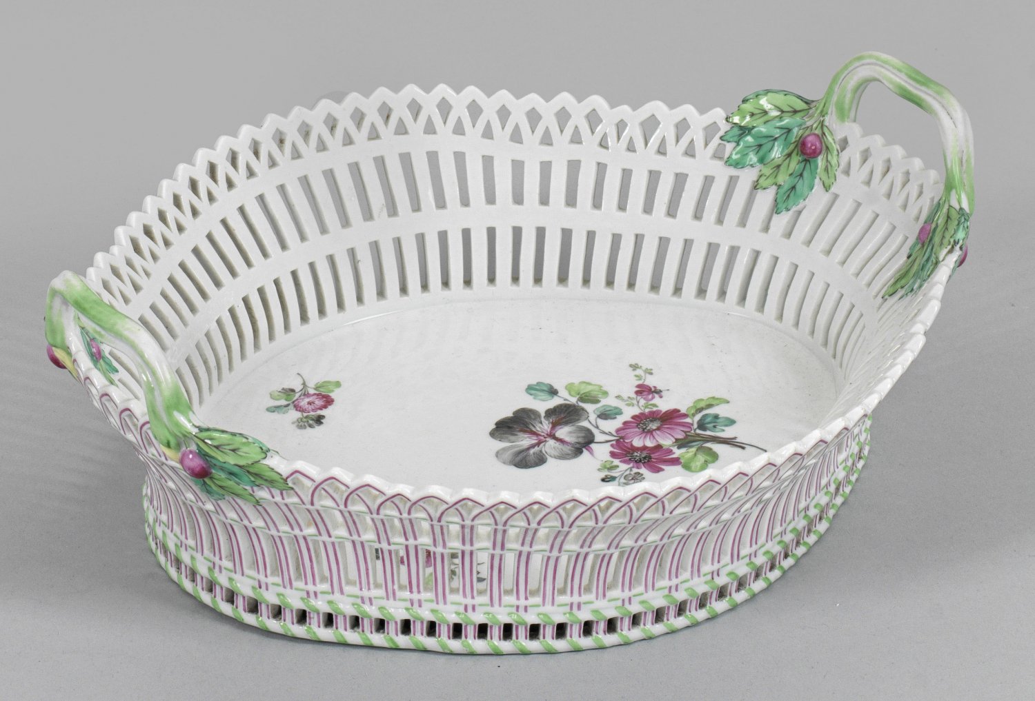 Englischer Fruchtkorb Geschweifte Form mit gezacktem Rand. Seitlich hochgezogene Asthenkel mit reliefiertem Blattansatz. Durchbrochen gearbeitete, in Purpur und Grün staffierte Wandung. Im Spiegel feines Blumenbukett sowie Streublumen in polychromer Malerei. Entw. Friedrich Elias Meyer. Zeptermarke. H. 9,5 cm. 25 cm x 23 cm.