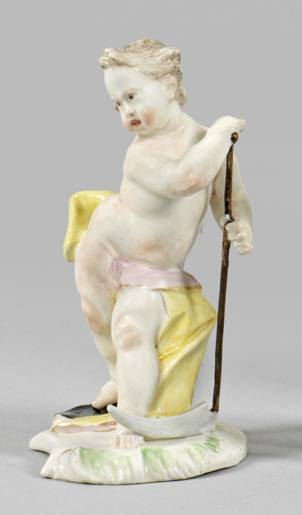 Putto als Saturn Auf rocailleförmig gerahmter Plinthe stehender Putto mit Lendentuch, mit dem rechten Fuß auf einem geöffneten Buch stehend und mit beiden Händen eine Sense haltend. Sparsame polychrome Malerei mit dezenter Goldkonturierung. Entw. Franz Anton Bustelli, um 1760. Ritz-Nr.; Minim. rest.; 3. H. 10 cm.
