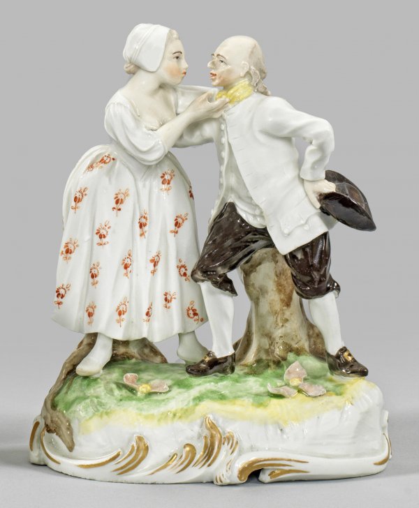 Bauernpaar Auf rocaillereliefiertem, mit plastischen Blüten belegtem Sockel stehendes, einander zuwendendes Paar. Entw. Karl Gottlieb Lück. Polychrome Malerei mit Goldkonturierung. Minim. rest.; Manufakturmarke. H. 15,5 cm.