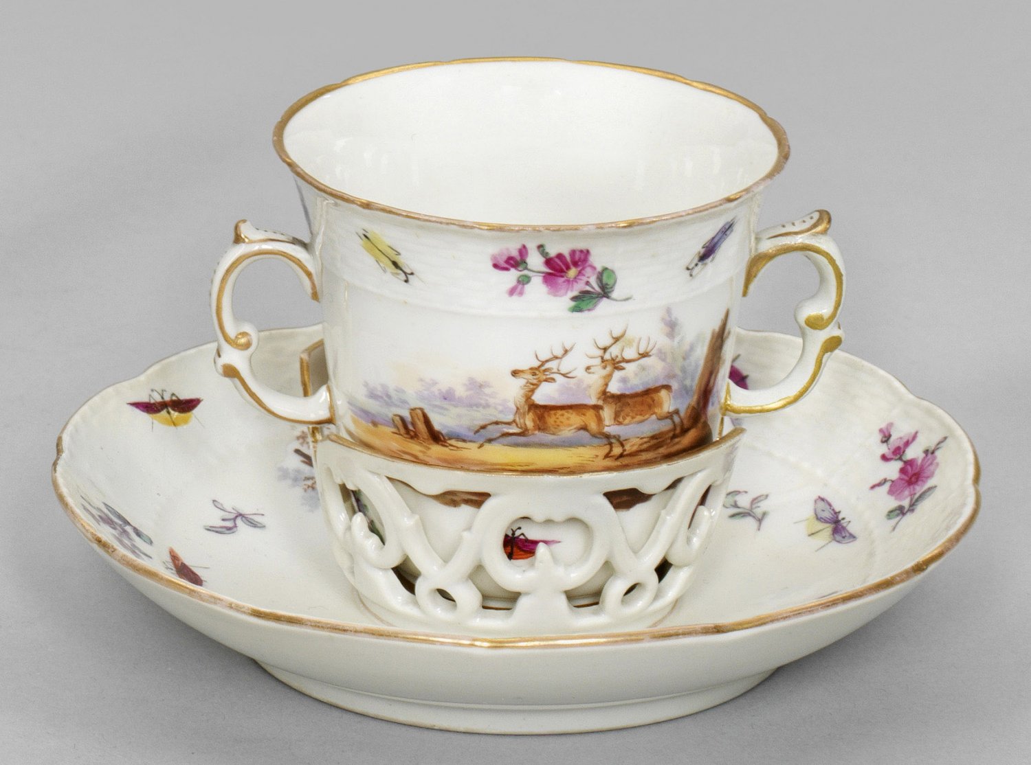 Trembleuse mit Jagddekor auf Untertasse. Sich konisch erweiternder Korpus mit Doppelhenkel. "Ozier"-Reliefdekor. Beidseitig der Wandung und im Spiegel jagdliche Motive mit Wildschweinhatz und Rehen zwischen farbigem Blumen- und Insektendekor. Polychrome Malerei mit Goldrand. Untertasse rest.; Zeptermarke. H. 7 cm.