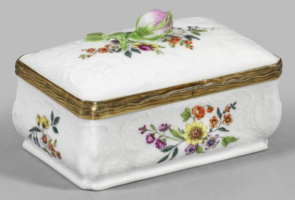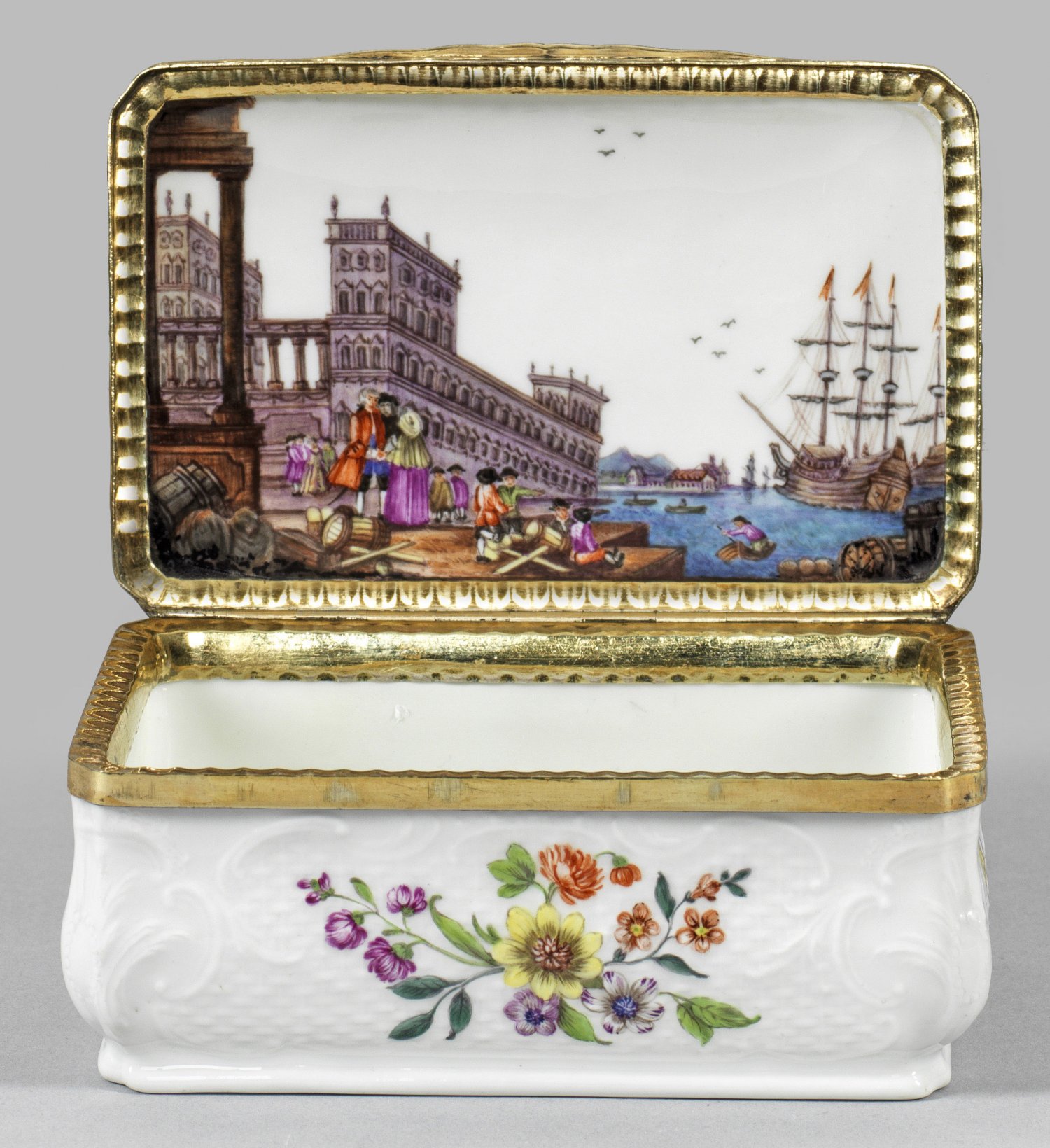 Zierdose mit Blumendekor und Venedig-Ansicht Porzellan. Rechteckiger, unterhalb gebauchter Korpus mit gekerbten Ecken. Gewölbter Deckel mit plastischem Rosenknauf. Auf der Wandung und dem Deckel Oberflächenrelief aus Altozier und floralen Rocaillekartuschen. Allseitig farbenprächtige, teilw. flach reliefierte Blumengebinde bzw. gestreute Blumen auf der Unterseite. Im Innendeckel großflächig angelegte Hafenansicht Venedigs mit Segelschiffen und Figurenstaffage. Äußerst feine polychrome Malerei. Vergoldete Silbermontierung mit Wellenprofil und geschweifter Daumenrast. H. 7 cm 11,5 cm x 7,5 cm.