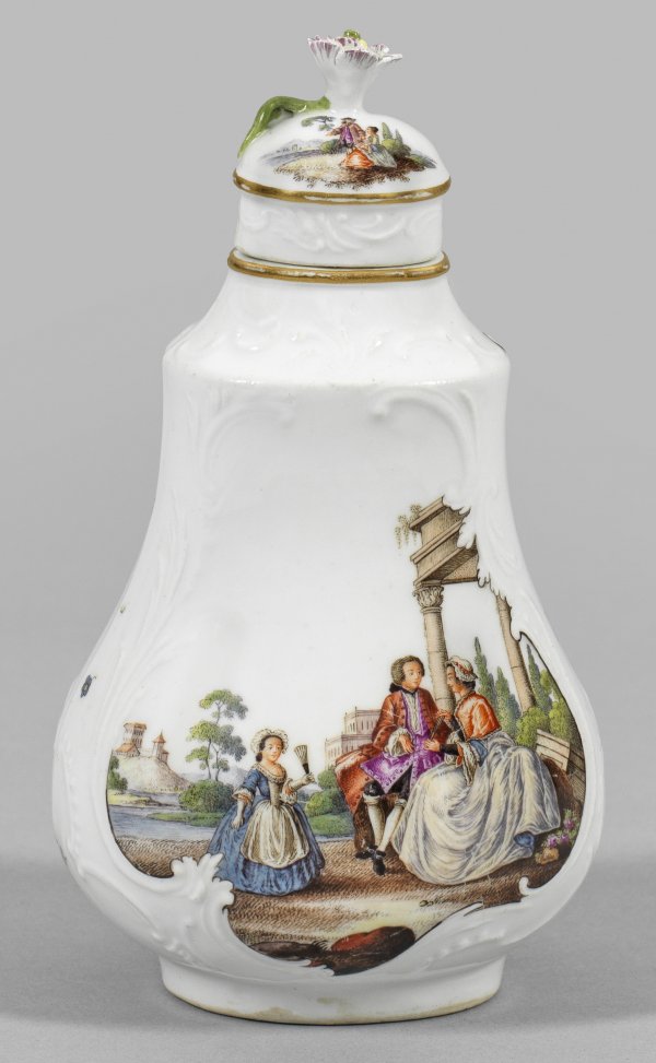 Teedose mit Watteauszenen Gebauchter, sich nach oben verjüngender Korpus auf ovalem Fußring mit abgesetzter Schulter, eingezogenem Hals und profiliertem Rand. Korrespondierender, übergreifender Deckel mit plastischem Blütenknauf. Beidseitig der Wandung rocailleförmige Reliefkartuschen mit großflächig angelegten Watteauszenen eines höfischen Paares bzw. eines Violinenspielers im Beisein eines Kindes vor reicher Architekturkulisse. Im Wechsel mit farbigem Streublumendekor. Feine, polychrome Malerei. Goldrand. Minim. rest.; Schwertermarke. H. 14,5 cm.