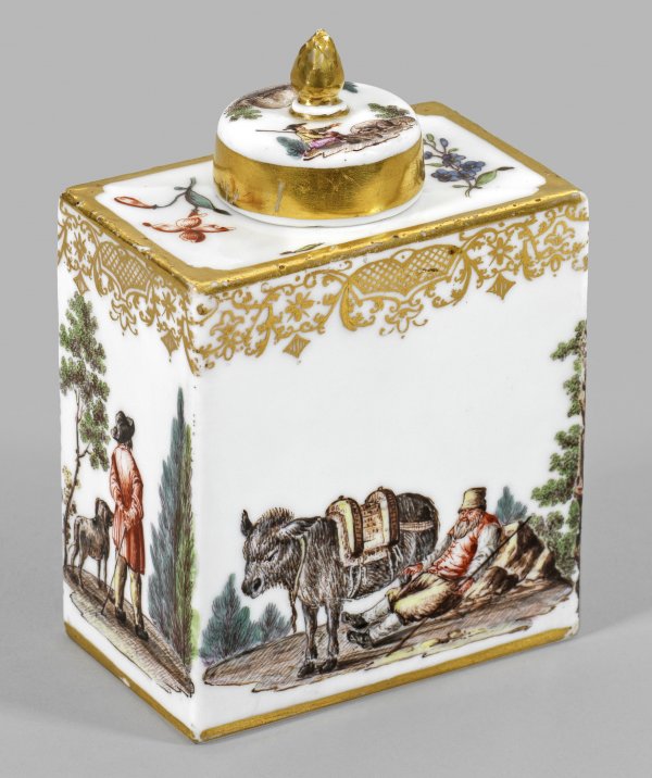 Teedose mit Teniers-Szenen Hochrechteckiger Korpus. Runder übergreifender Deckel mit plastischem Pinienknauf. Auf der Wandung und dem Deckel sog. Teniers-Szenen. Beidseitig der Wandung Darstellung eines alten an einem Fels lehnenden Bauern bei der Rast mit einem Esel bzw. einer schlendernden Bäuerin mit Korb in Begleitung eines Kindes. An den Schmalseiten Wanderer mit Stock bzw. Herr beim Spaziergang mit seinem Hund in naturalistischer Landschaftskulisse. Korrespondierende Szene mit Schäfer auf dem Deckel. Auf der flachen Schulter farbige Zweige von Holzschnittblumen. Polychrome Malerei mit breiter feinliniger Goldspitzenbordüre. Gold-Nr. 34. H. 12 5 cm.