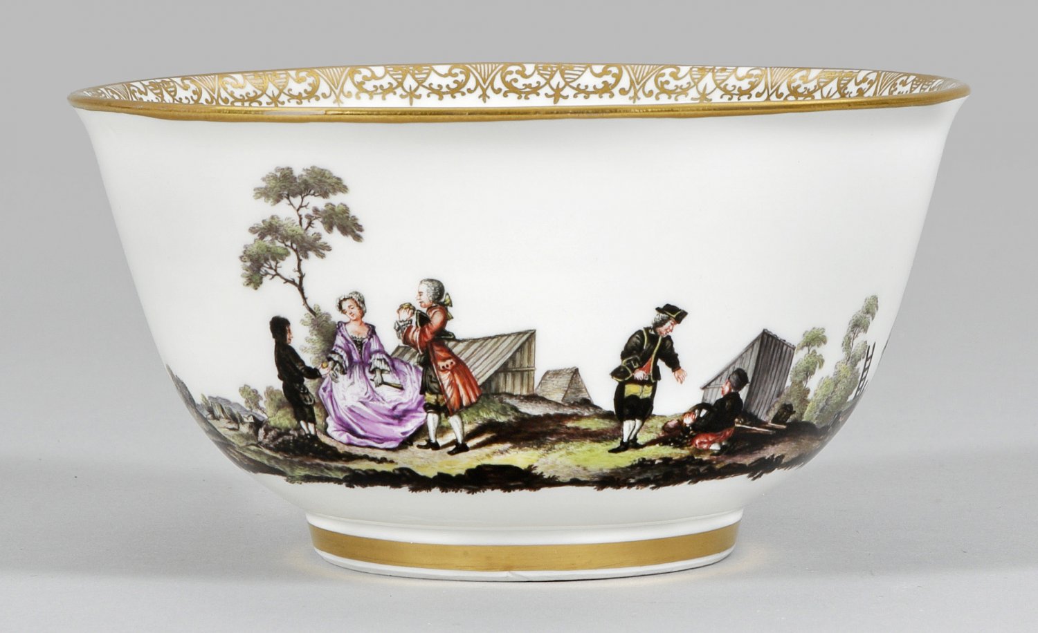 Zierkumme mit Bergmannsdekor Auf kurzem Standring bauchiger, geschweift ansteigender, gemuldeter Korpus mit leicht ausschwingendem Rand. Auf der Wandung umlaufende, szenische Darstellungen aus dem Arbeitsleben Sächsischer Bergleute in felsiger, baumbestandener Hüttenlandschaft. Adliges Paar beim Besuch des Hüttengeländes, Bergmänner beim Aussieben, Zerkleinern, Aufladen bzw. Abtransportieren von Rohmaterial, teilw. im Beisein eines Bergbeamten sowie ein Bergmann bei der Rast in feiner polychromer Malerei. Innenrand mit breiter Goldspitzenbordüre sowie Goldornament im Spiegel. Äußerst feine polychrome Malerei mit reichem Golddekor. Schwertermarke. H. 8,5 cm.