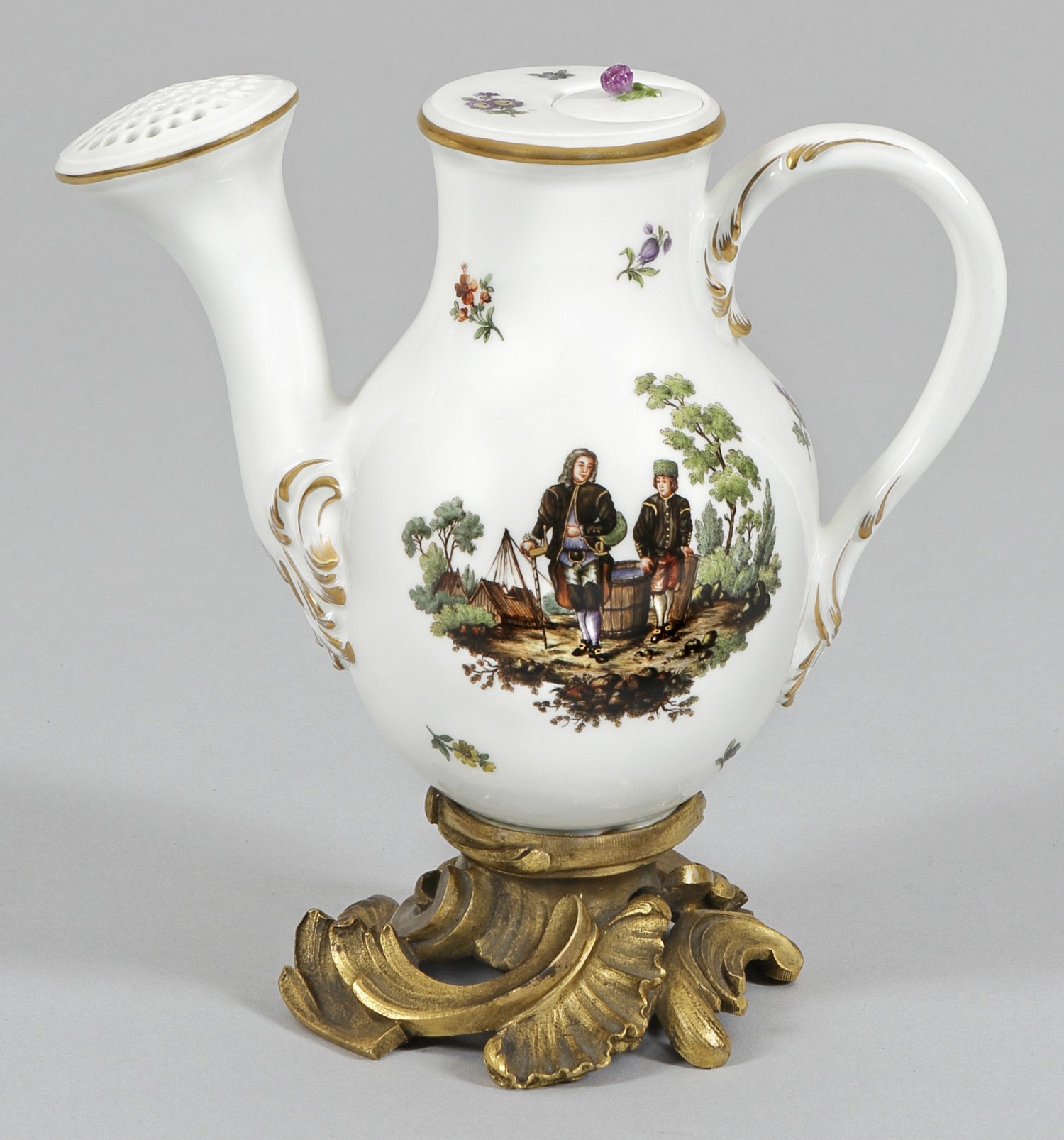 Seltene Ziergießkanne mit Bergmannsdekor auf reliefplastischem, durchbrochen gearbeitetem Bronzesockel. Birnförmiger Korpus mit blattreliefiertem Ohrenhenkel sowie tief ansetzendem, sich trompetenartig erweiterndem Ausguss, in rundem, siebartigem Abschluss endend. Flacher, eingelassener Deckel mit plastischem Blütenknauf. Beidseitig der Wandung szenische Darstellung von Sächsischen Bergleuten in Hüttenlandschaft. Schauseitig ein sich auf seinen Häckel stützender Bergoffizier bei der Unterweisung eines Pochjungen, rückseitig Hüttenbeamter im Gespräch mit einem Jungen. Umlaufend farbenprächtige, gestreute Blumen. Äußerst feine polychrome, teilw. goldgehöhte Malerei. Goldstaffage. Schwertermarke. Ges.-H. 18,5 cm.