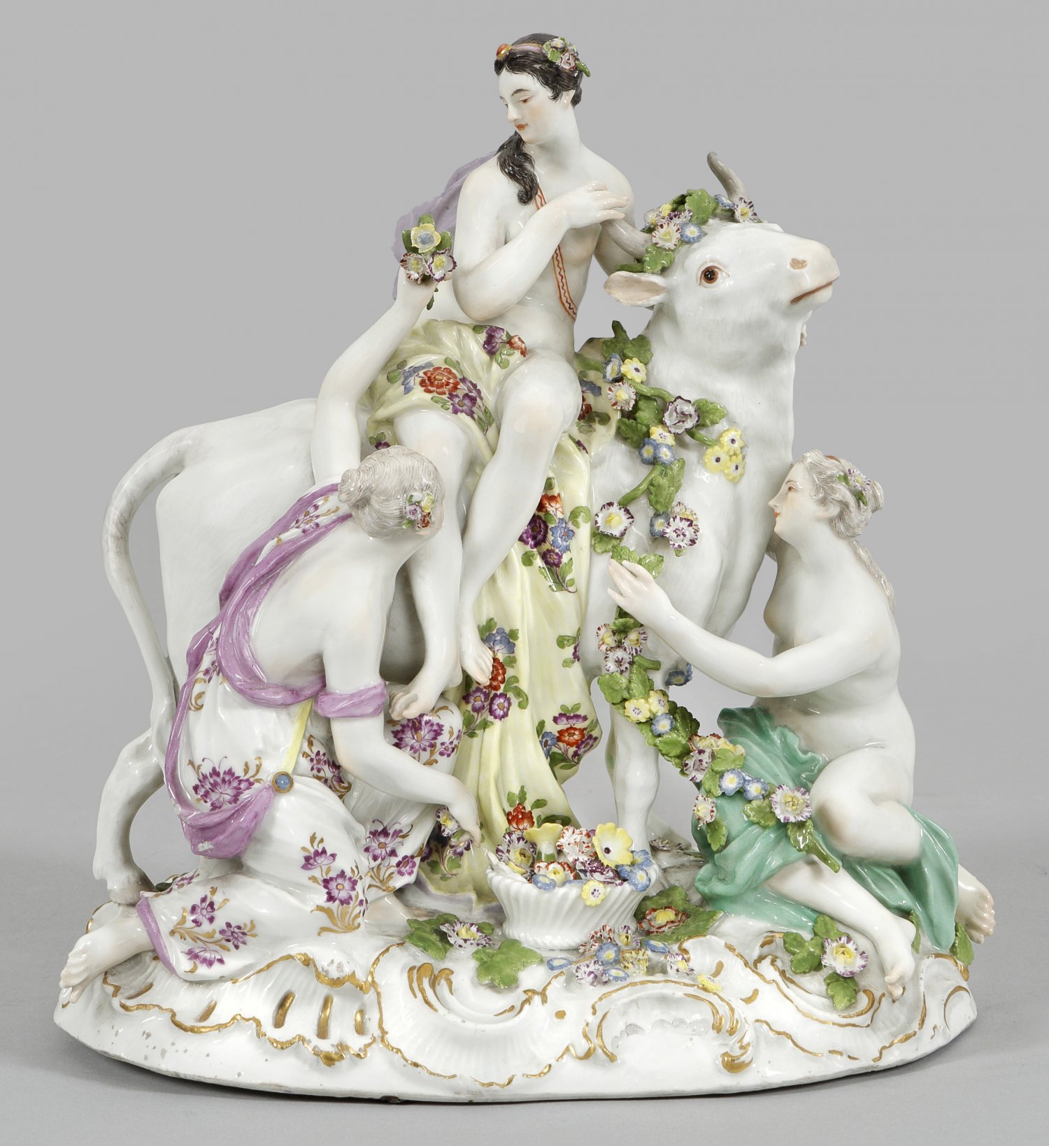 Figurengruppe "Europa auf dem Stier". Originaltitel Auf rocailleförmig gerahmtem, mit plastischen Blüten und Blättern belegtem Sockel stehender, von einer langen Blumengirlande geschmückter Stier, darauf sitzende Europa im zartgelben, mit Indianischen Blüten gemusterten Gewand. Das Haar bekrönt von einem Diadem. Seitlich zwei kniende Nymphen mit Blumenkorb. Polychrome Malerei mit Goldstaffage. Entw. Johann Joachim Kaendler. Unw. rest./best.; Schwertermarke. H. 22 cm.