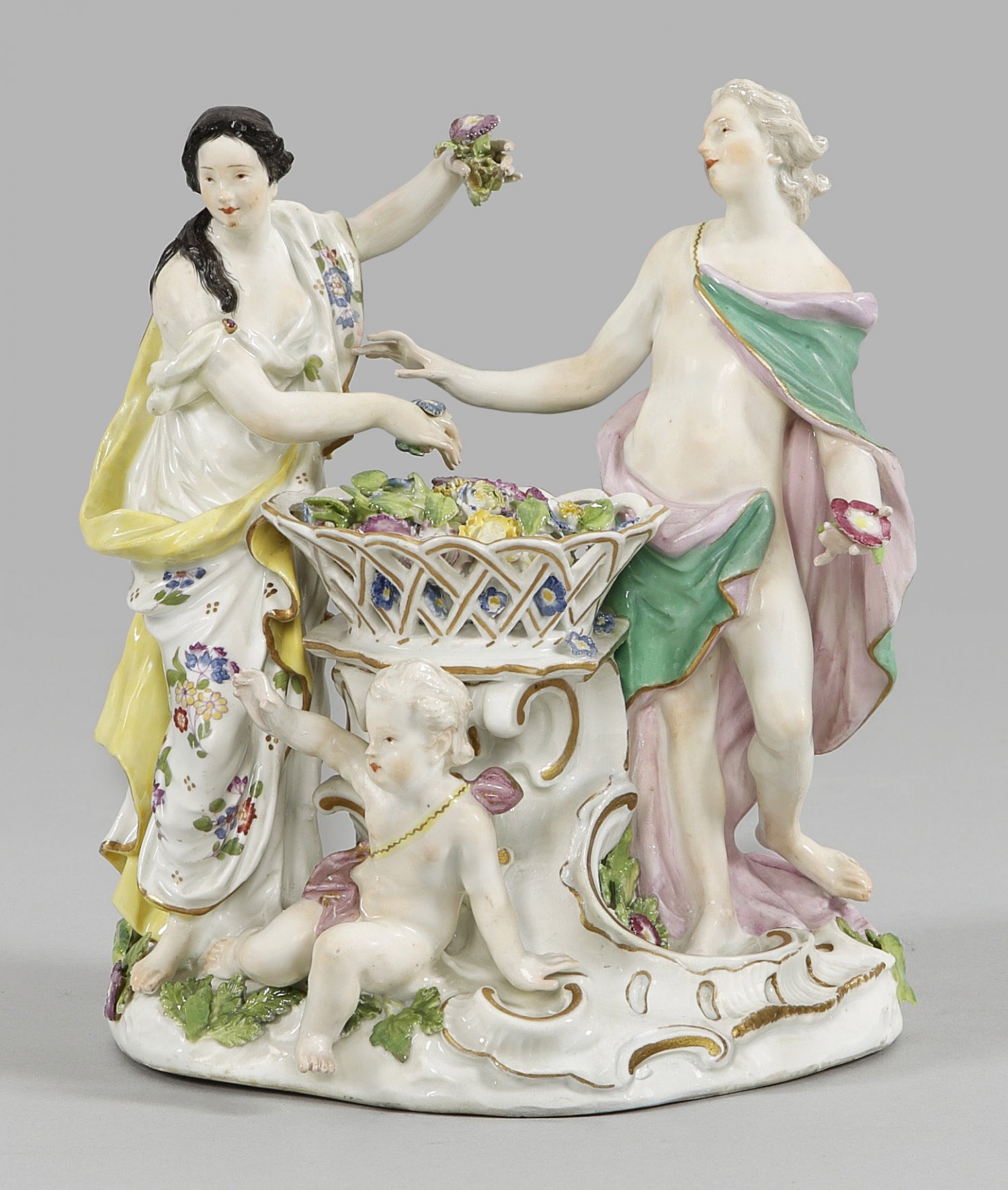 Allegorische Figurengruppe "Der Frühling" Auf einem mit plastischen Blüten und Blättern belegten, rocailleförmig gerahmten Sockel stehender Apoll mit faltenreichem Umhang in Seegrün und Rosa, auf die Göttin Venus in blütengemustertem Gewand rechts neben ihm weisend, die ihren Blick abwendet. Zwischen ihnen, auf emporsteigender, reliefplastischer Volute stehender, großer Durchbruchkorb mit plastischen Blüten. Zu ihren Füßen sitzender Putto. Entw. Johann Joachim Kaendler. Polychrome Malerei mit Goldkonturierung. Rest.; Schwertermarke. H. 19 cm.