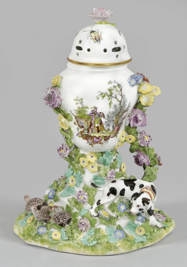 Jagdliche Potpourrivase Auf felsartig aufsteigenden, mit üppigen plastischen Blüten und Blättern belegten Sockel sitzende Fasanenhennen und sich anschleichender Jagdhund als Träger für eine Balustervase. Haubenartiger, durchbrochen gearbeiteter Deckel mit Rosenknauf. Beidseitig der Wandung, von feinplastischen Blütenranken umzogene szenische Darstellung eines Jägers mit Hund und erlegtem Tier bzw. eines Gehöftes mit Rebhühnern und Enten. Auf dem Deckel Insektenmotive. Polychrome Malerei. Goldrand. Entw. Johann Gottlieb Ehder, um 1747. Rest.; Schwertermarke. H. 22 cm.