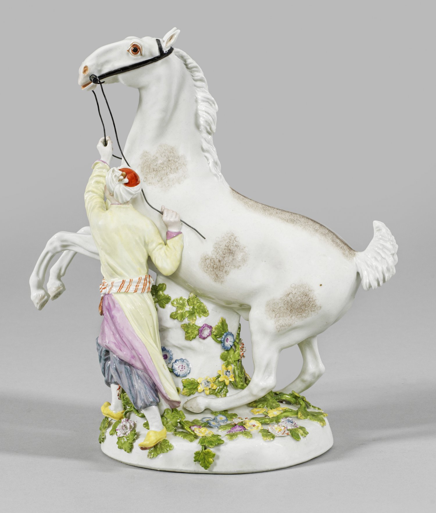 Seltene Figurengruppe "Türke mit Spanischem Pferd" Auf ovalem, mit plastisch aufgelegten Blatt- und Blütenranken umzogenem Sockel ein sich mit den Vorderläufen aufbäumender Schimmel. Seitlich stehender Orientale in zartgelbem, gegürtetem Mantel, Pluderhose und Turban, mit ergriffenen Zügeln das Pferd bändigend. Polychrome Malerei mit dezenter Goldstaffage. Entw. Johann Joachim Kaendler. Zügel ersetzt. Rest.; Schwertermarke. H. 26,5 cm.