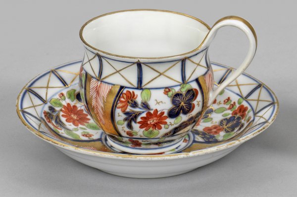 Ziertasse mit Imari-Dekor auf Untertasse. Gebauchter Korpus. Seitlich hochgezogener Campanerhenkel. Umlaufender Dekor im Stil der japanischen Imari-Porzellane. Unterglasurblaue Malerei mit Überdekoration in Grün und Eisenrot sowie reicher Goldstaffage. Teilw. unw. rest.; Schwertermarke. H. 7,5 cm.