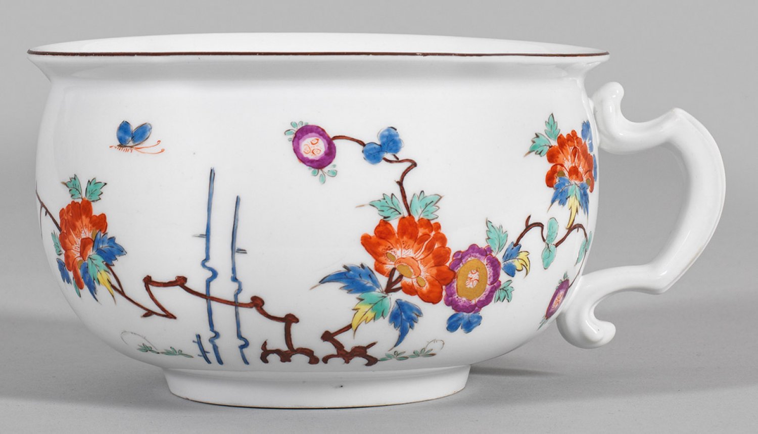 Bourdalou mit "Kakiemon-Dekor" Ovaler, leicht gebauchter Korpus mit geschwungenem, profiliertem Bandhenkel. Umlaufend auf der Wandung stilisierter "Kakiemon-Dekor" aus großen Päonienzweigen zwischen Bambusstäben, umgeben von einem Phoenixvogel, Insekten und Schmetterlingen sowie asiatischen Steublumen. Im Spiegel kleines Blumengebinde. Polychrome, teilw. goldgehöhte Malerei. Dunkelbrauner Rand. Schwertermarke. H. 10 cm.